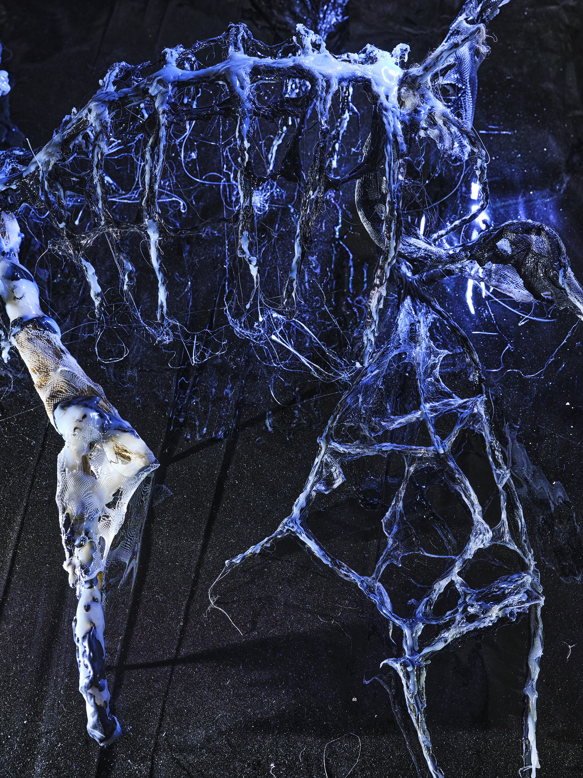 3D printing, hot melt adhesive, copper wire, polyethylene, reflective black film, light fixture, speaker system; sound art (9 min)